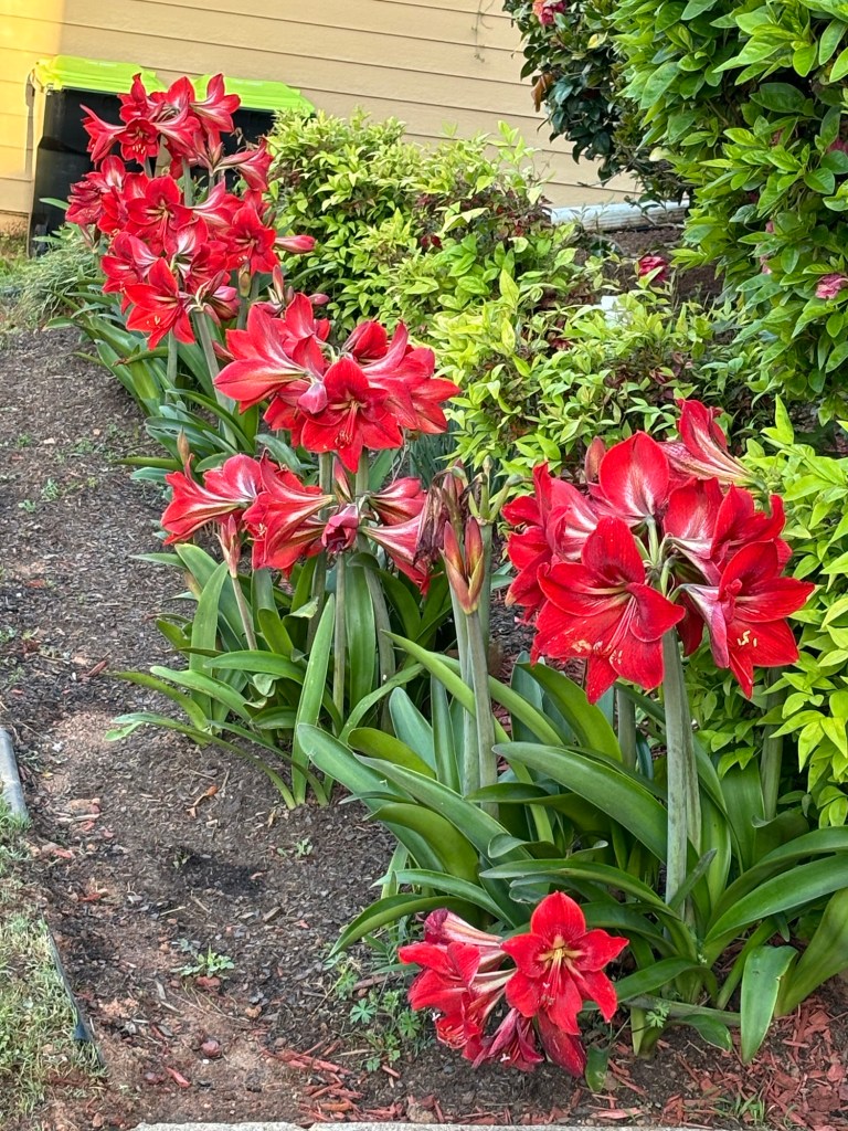 Hedges no longer overgrown to the roof. Day Lillie’s welcome visitors to the front door and zinnia stand at attention in front of the amaryllis. The red mulch also makes the landscape pop.